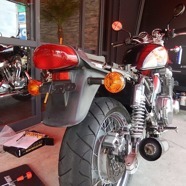 フェンダーレスキットの取り付けです♪ その他にも、UPハンドル、ハーネスの延長ヨーロピアンウィンカーと様々なお客様のこだわりカスタムに アレンジさせて頂きました♪♪