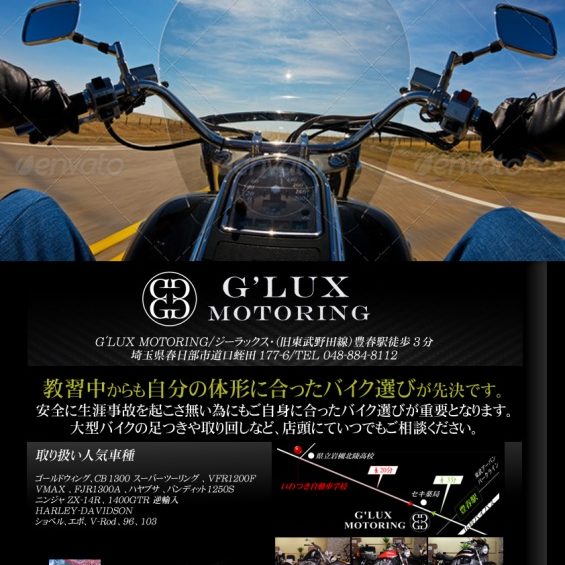 HP公開致しました。 今後も、G’LUX MOTORINGをよろしくお願いします。 株式会社G’LUX 〒 344-0045 埼玉県春日部市道口蛭田177-6 TEL 048-884-8112 F…