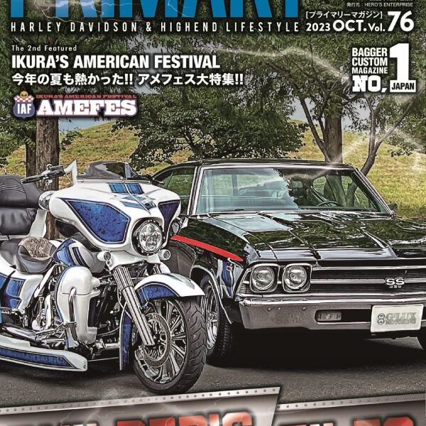 先日発売のハーレーカスタム雑誌「PRIMARY」の今月号にて 当社G’LUXなんと表紙を飾らせて頂きました!! 当社の制作車両の トライグライド と社長の愛車 シボレーシェベルSS のツーショットが目を引く表紙となってお…